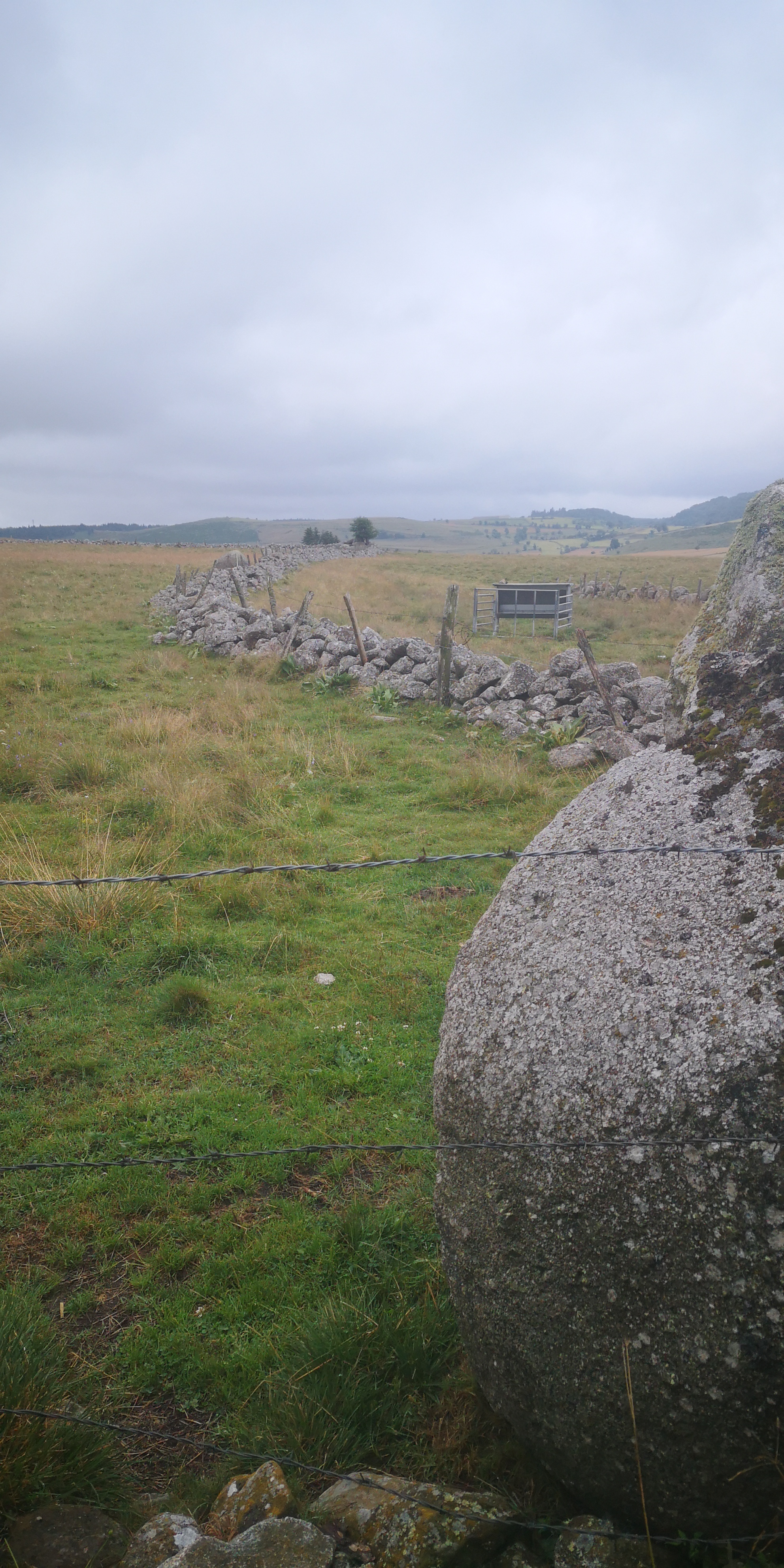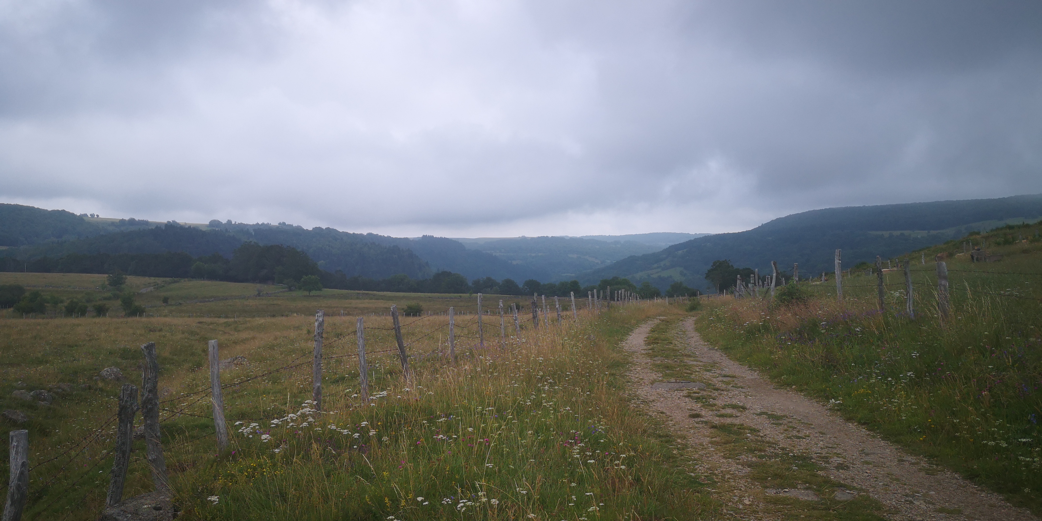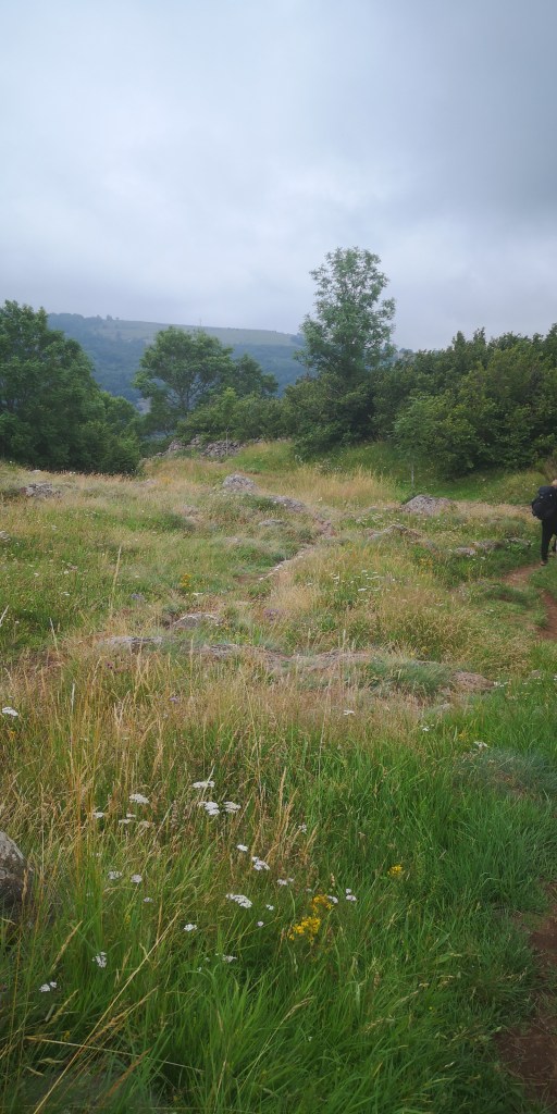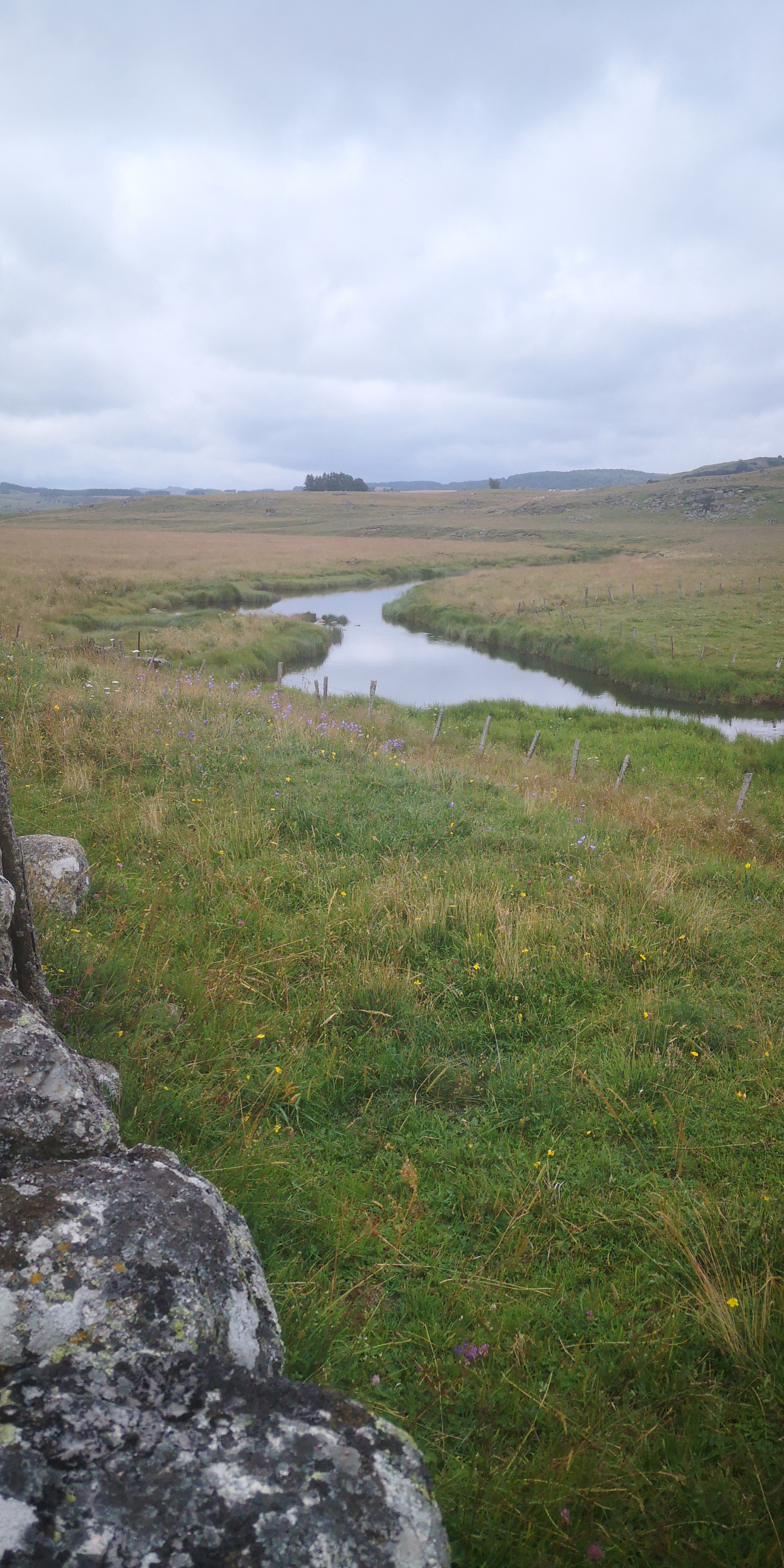 Mais ici tout passe vite, le ciel chargé , qui nous accompagne depuis la fin de l’orage, fini par se lever, à la pause déjeuner. Et nos 2 grandes sauterelles requinquées entameront la descente vers St Chély d’Aubrac en tête et d’un pas décidé.