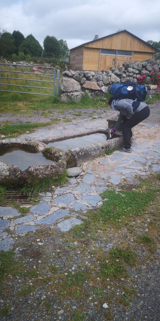 Nous reprenons le chemin sous le soleil. Dans la première montée, nous prenons une leçon de courage en croisant une jeune pèlerine belge, équipée d’une prothèse totale de jambe qui ne s’en laisse pas compté et avale les kms avec un très bon rythme… Total respect…