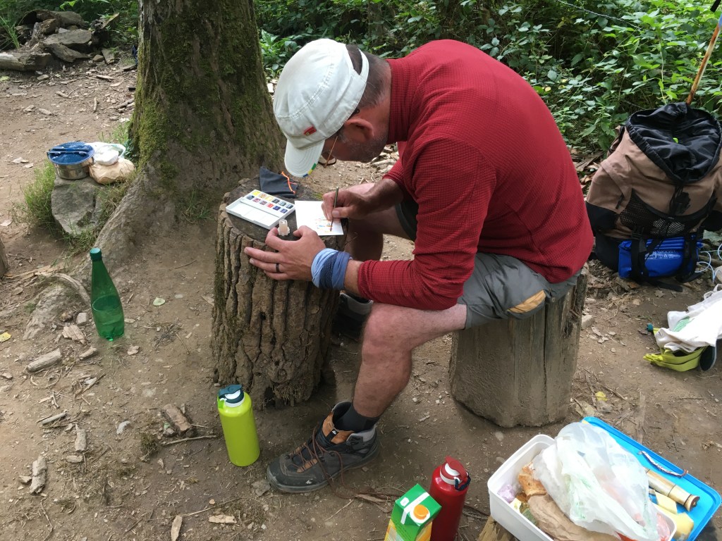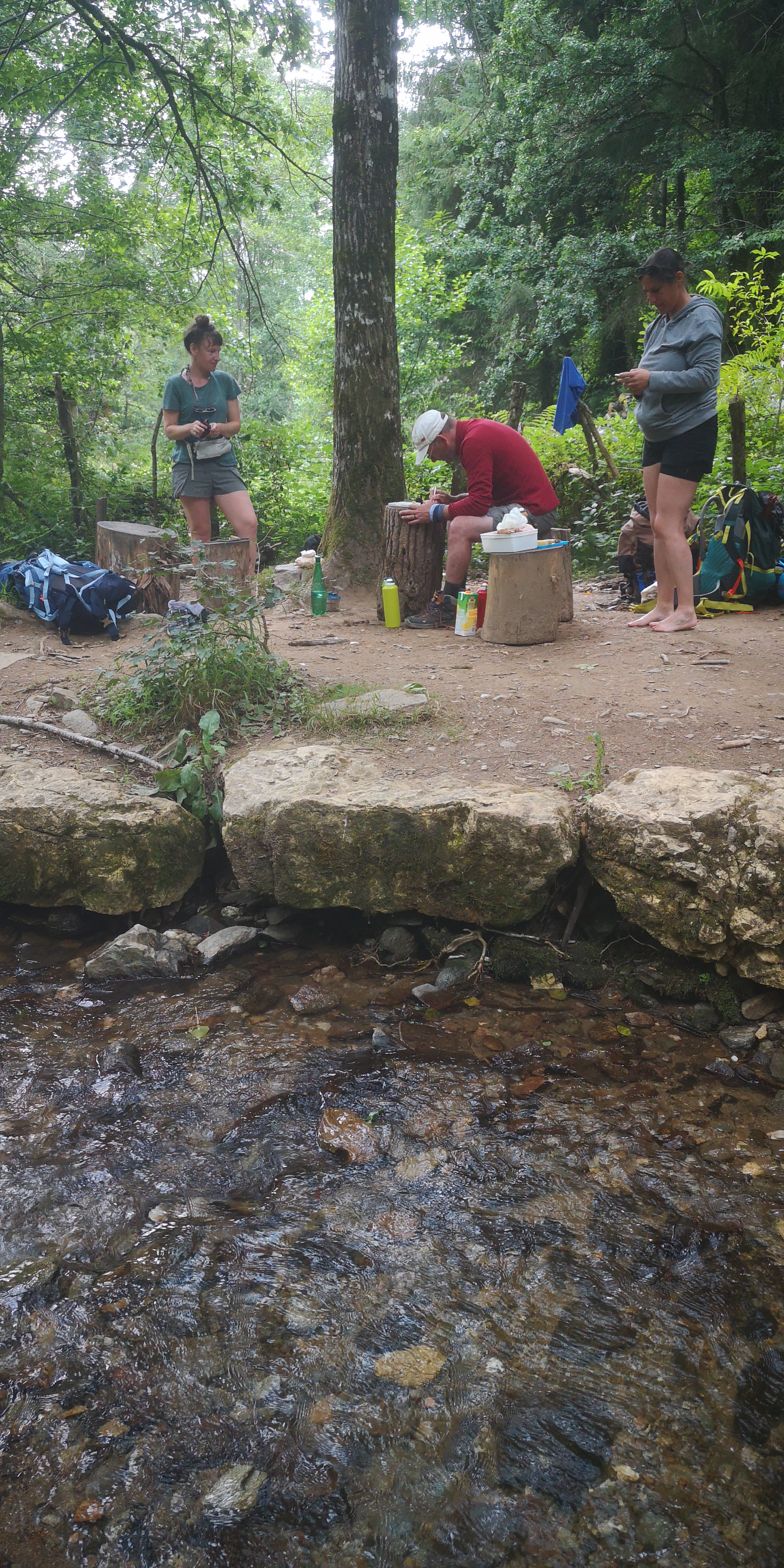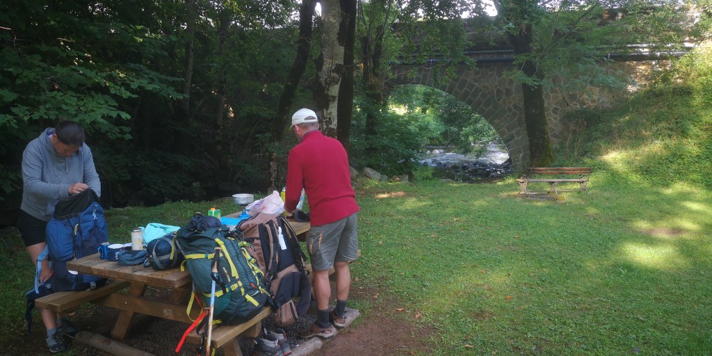 La faim venant à se faire sentir, nous décidons de nous arrêter au bord d’un ruisseau où quelques rondins, coupés en tabourets improvisés, nous attendent. Nous partageons le repas avec Flora, et quelques pèlerins nous croisent, nous nous souhaitons mutuellement le bonjour et le bon appétit.