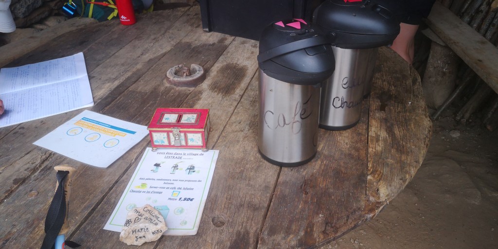 Poursuivant notre chemin, nous tombons sous peu sur une aire de pause proposée à la mode Norvégienne où pour la somme laissée d’un modique euro cinquante, vous pouvez profiter d’un thé, jus d’orange ou café. Nous profitons donc de la formule hospitalière et faisons le bonjour et souhaitons le bon chemins aux pèlerins de passage.