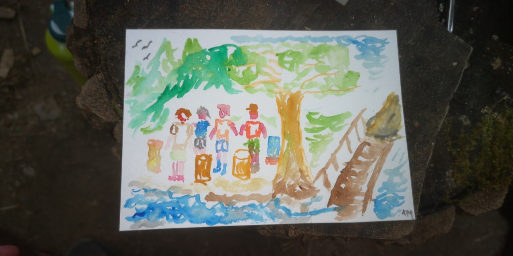 Flora finit par nous parler de son idée de faire se partager des cartes postales entre pèlerins. Il s’agit de réaliser une aquarelle sur une carte postale timbrée, où l’on y appose son adresse et en retour elle nous donne celle qu’un pèlerin de la veille a dessiné. Une belle idée pour quelqu’un qui se veut voyager seule !