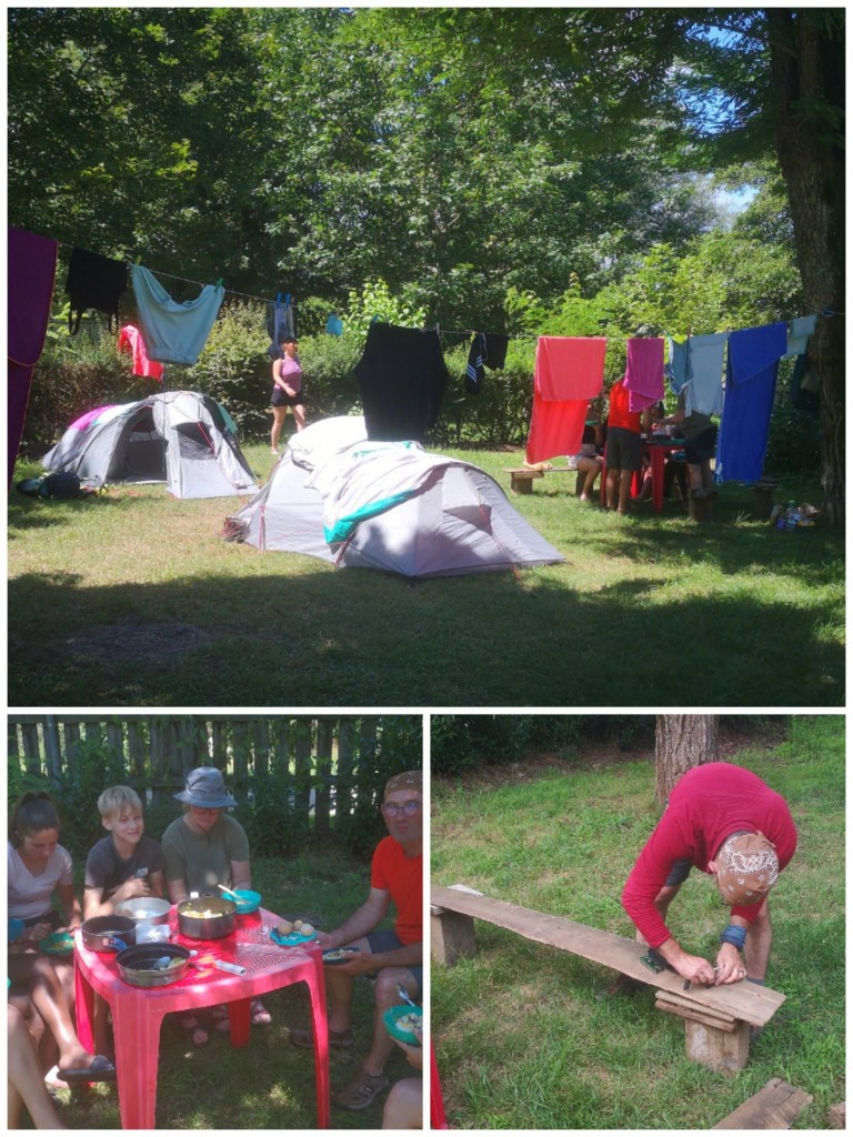 Le camping étant peu équipé, qu’à cela ne tienne ! Nous avons ratissé tout le camping à la recherche de planches et bouts de bois. Tel Robinson Crusoe, Xavier et Stéphane nous ont fabriqué des bancs.