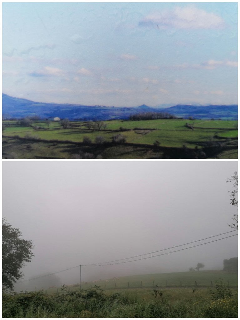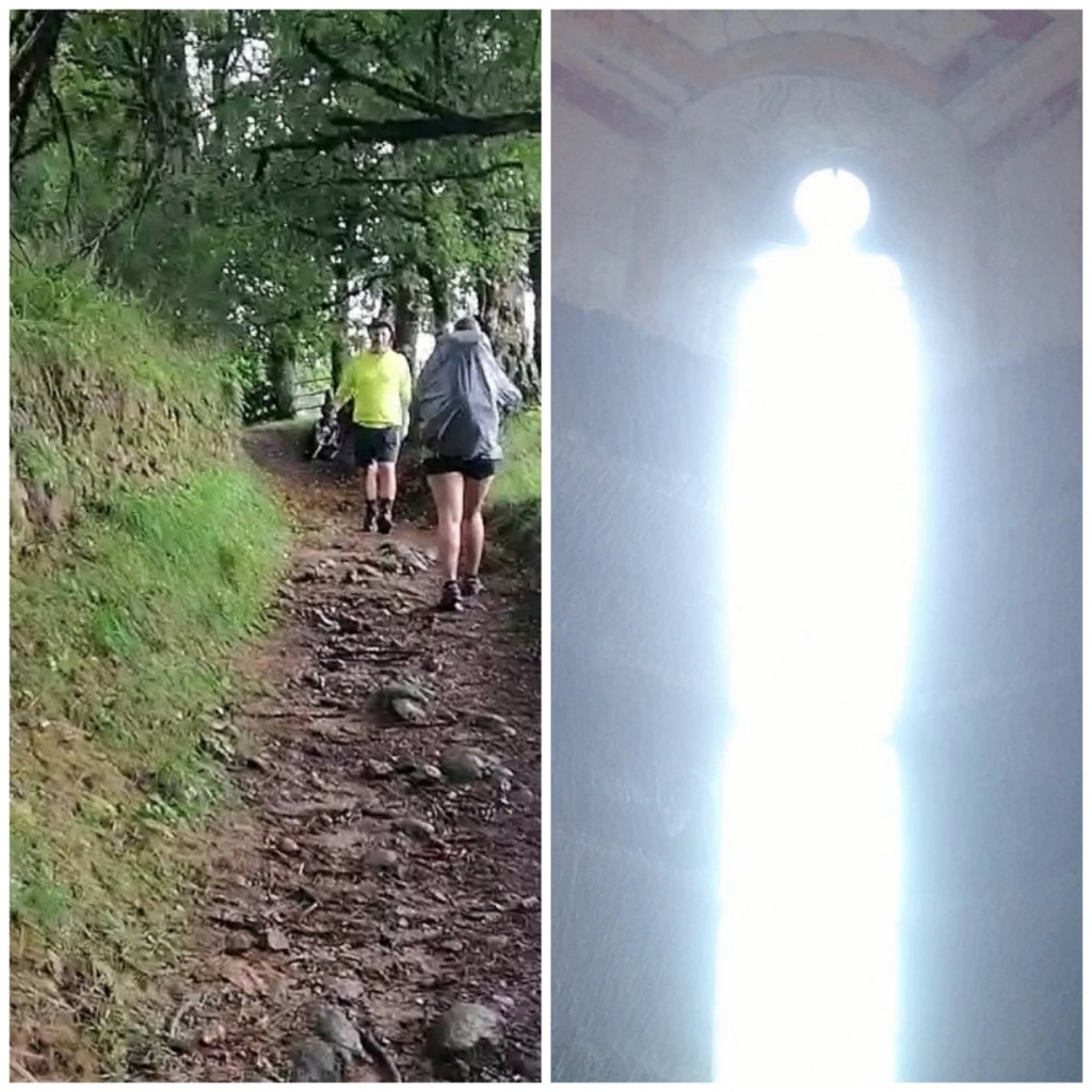 Celui-ci se termine sur une route goudronnée en lacets , bon nous voilà parti pour se manger du bitume, tête baissée, on se concentre sur nos pas. L’ ascension faisant étape sur un point de vue un peu bouché. Nous sommes quelques pèlerins à s’y arrêter et à se l’imaginer dans la brume…