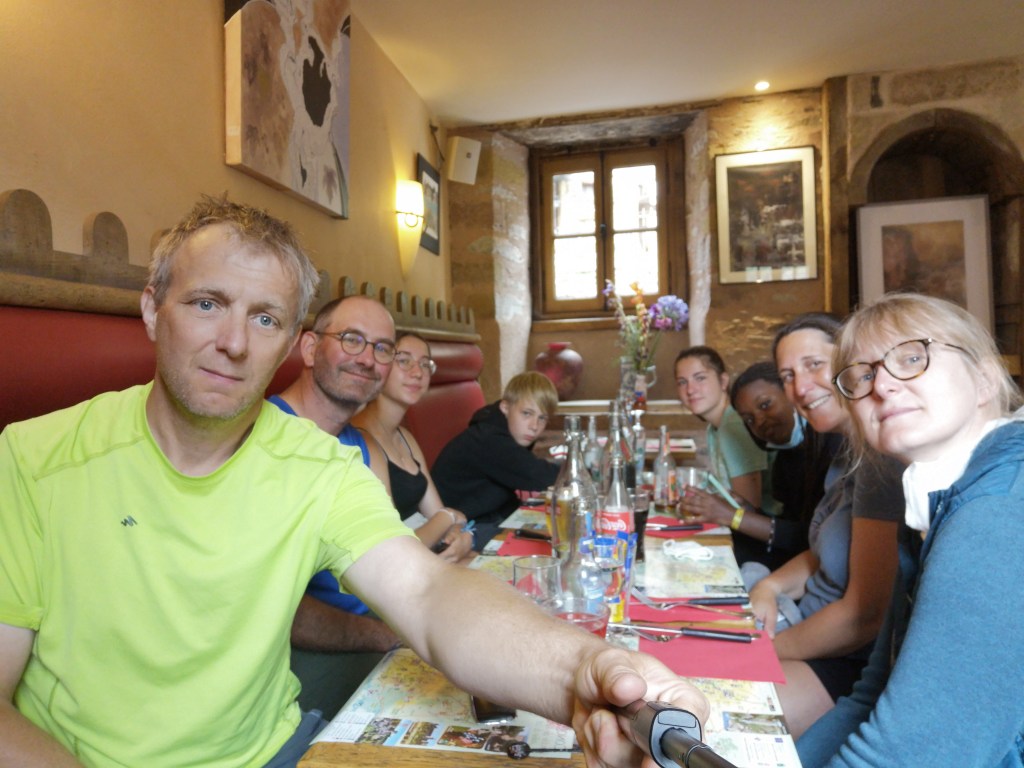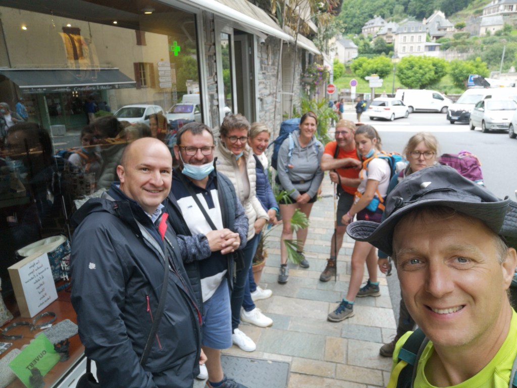 Nous voilà errant dans les rues et que voyons nous ?? Luc- Monsieur le maire d’Hon Hergies, Hélène son épouse, David et Delphine ! Retrouver notre village à Estaing, voici une coïncidence des plus incongrue ! Et bien c’est probablement cela aussi le chemin 😂