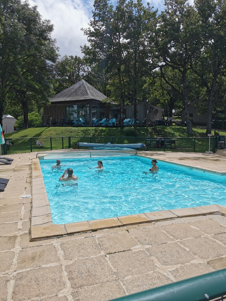 La pluie s’arrête et c’est sous le soleil que nous profitons, Xavier, Perrine.,Charlotte et moi de la piscine du camping. L’eau n’atteint pas les 27°annoncés par le patron, mais c’est bien agréable. Nous l’avons d’ailleurs pour nous tout seul.