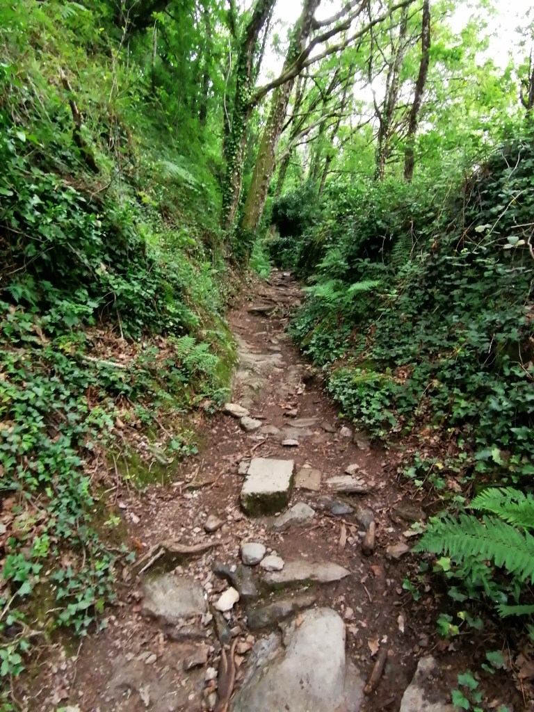 Une longue descente empierrée dans une forêt dense le long de murets de pierres recouvertes de mousse.